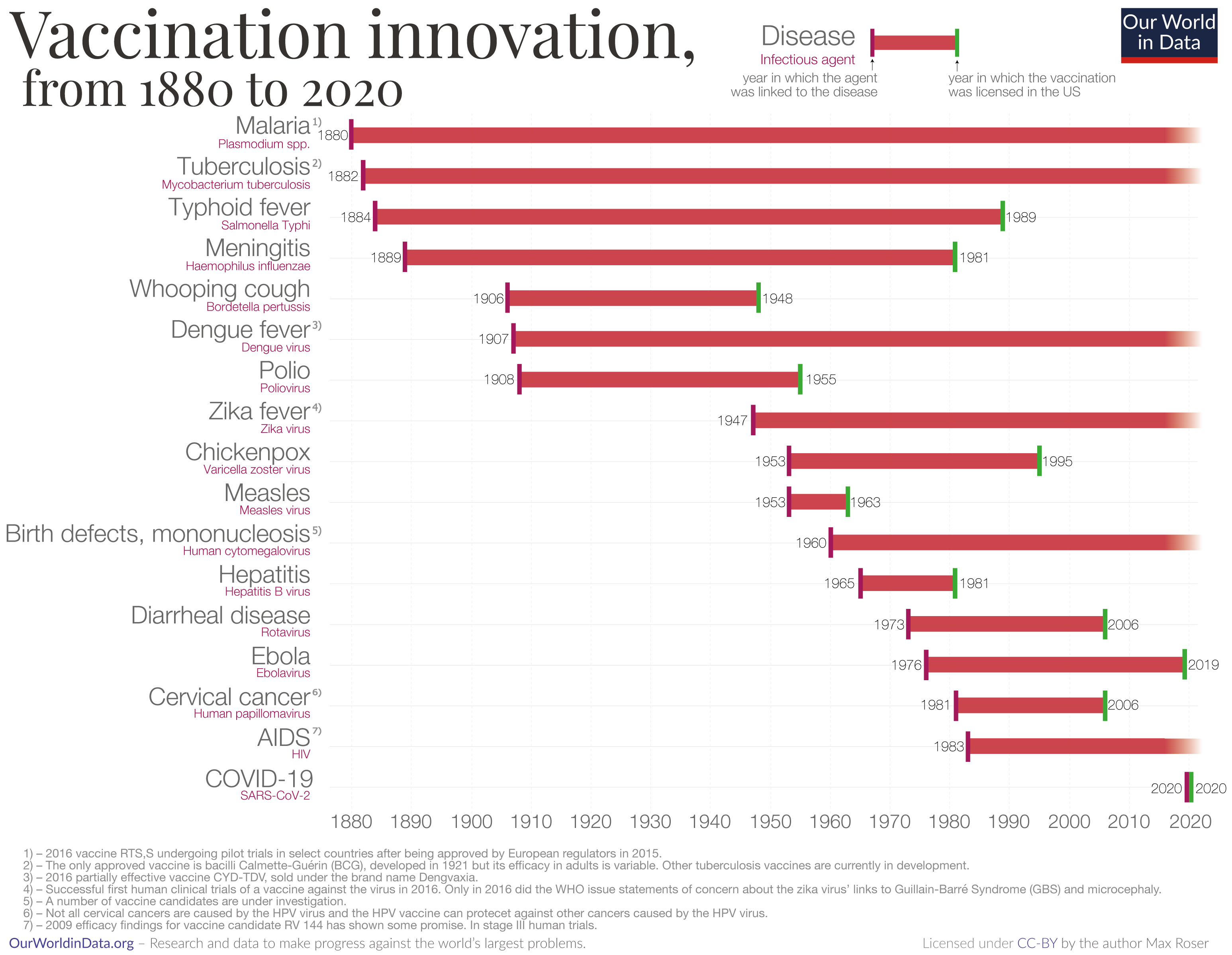 One is that there was a very high level of research and development funding compared to other diseases, as seen in the chart below. Many candidate vaccines were, therefore, developed and tested in clinical trials.