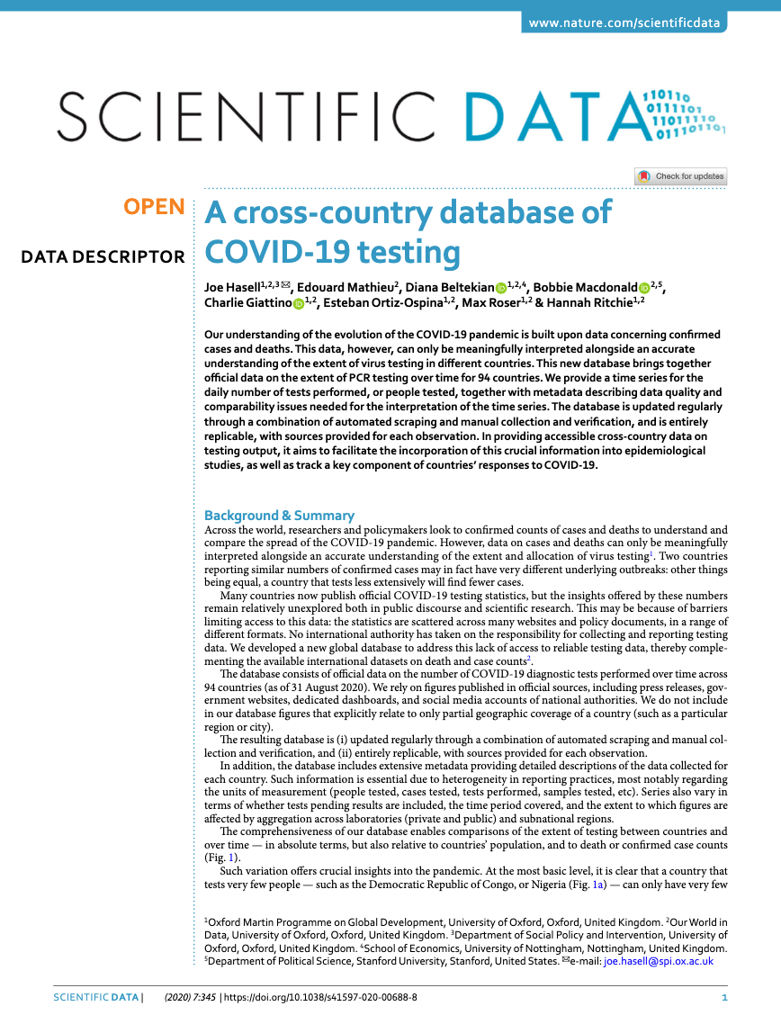 Because testing was limited, we at Our World in Data started building a testing database early on in the pandemic, to show the levels of testing over time and how they related to the number of cases detected. We published this database in the journal Nature Scientific Data.