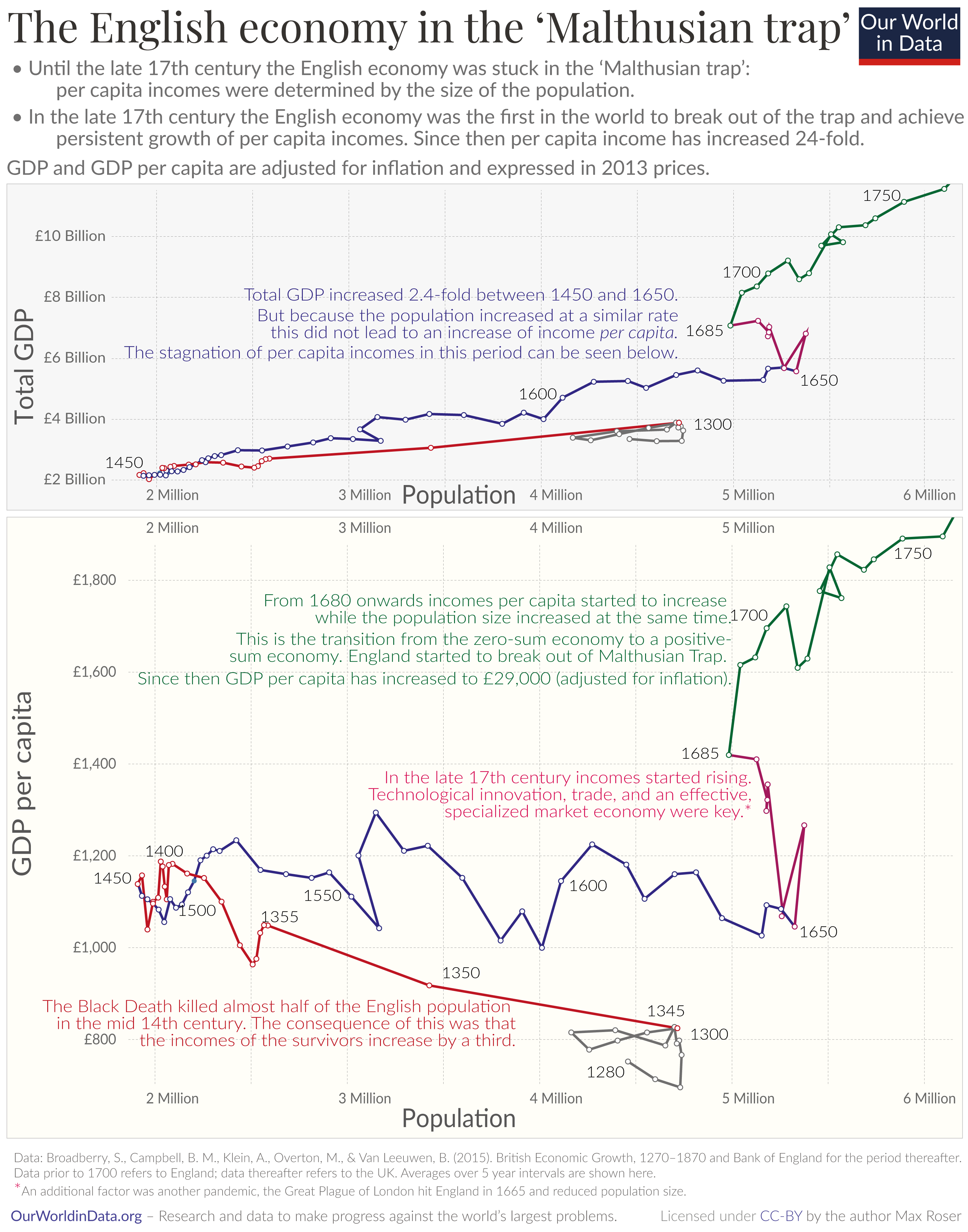 Max Roser (2020) - “Breaking out of the Malthusian trap: How pandemics allow us to understand why our ancestors were stuck in poverty” Published online at OurWorldinData.org. Retrieved from: 'https://archive.ourworldindata.org/20260410-215714/breaking-the-malthusian-trap.html' [Online Resource] (archived on April 10, 2026).BibTeX citation