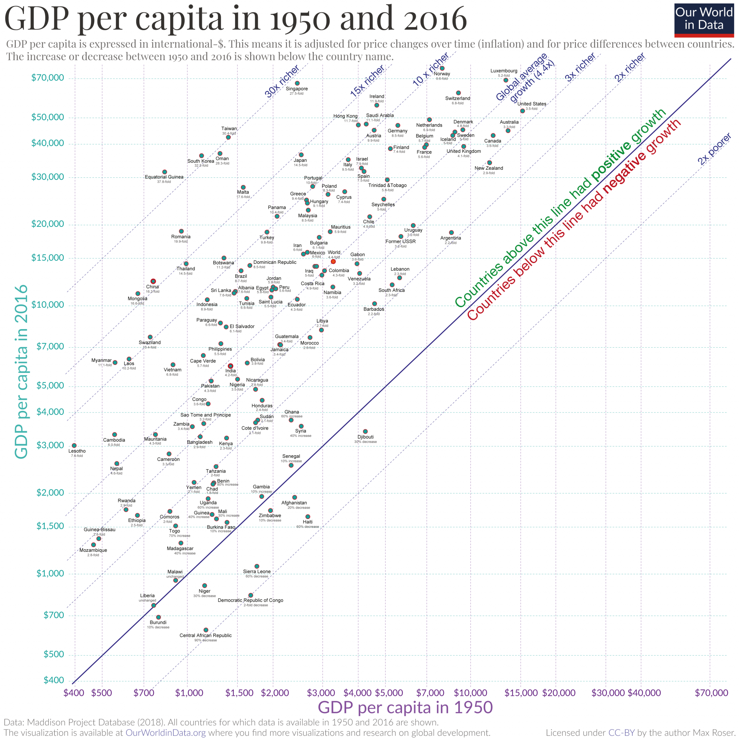 The average person in the world is 4.4-times richer than in 1950. But beyond this global average, how did incomes change in countries around the world? Who gained the most, and who gained the least? And why should we care about the growth of incomes? These are the questions I answer in this post.