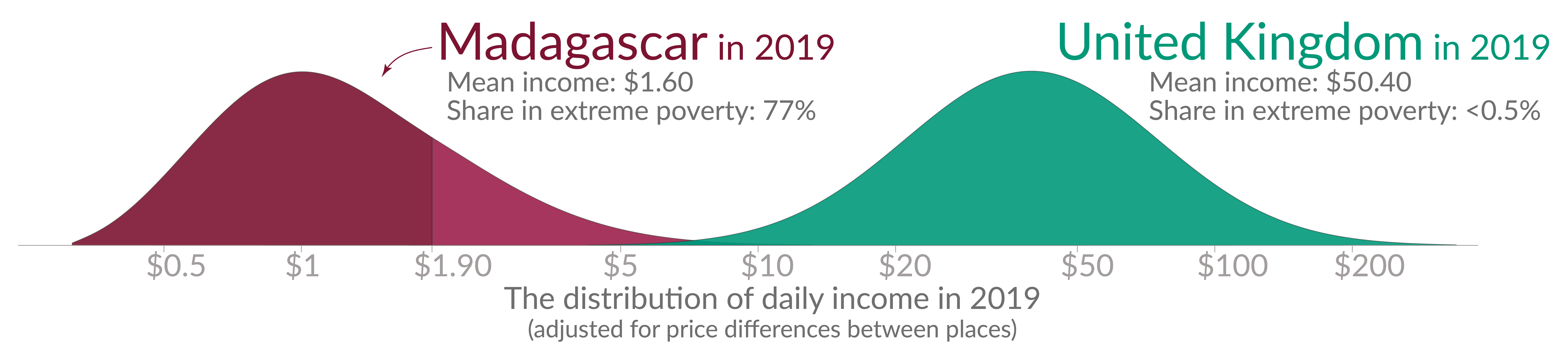 The data shown in the small plots of the income distribution in the UK and Madagascar is again taken from PovcalNet – the predecessor to the World Bank's Poverty and Inequality Platform – Gapminder, and Michail Moatsos 2021.