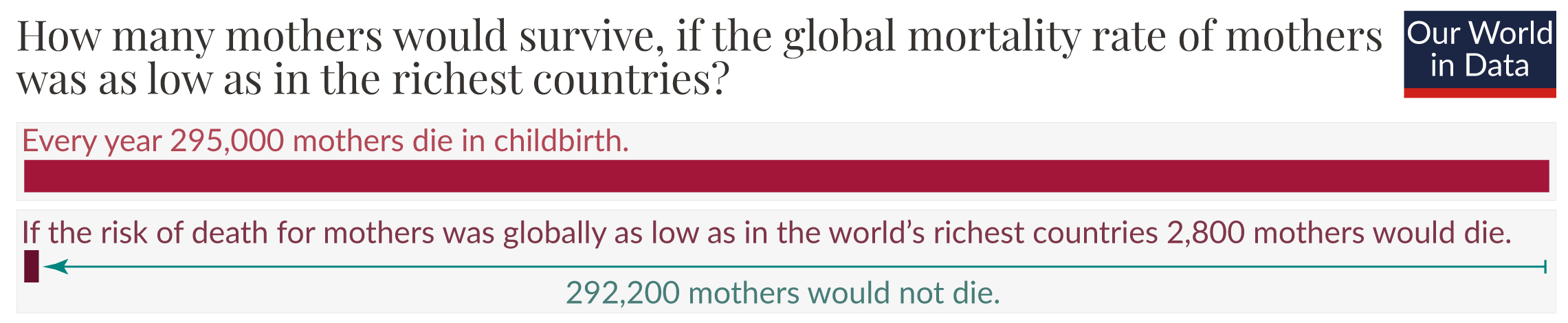 Every year 295,000 mothers die in childbirth. If the risk of death for mothers were globally as low as in the world’s richest countries, 2,800 mothers would die. 292,200 mothers would not die.