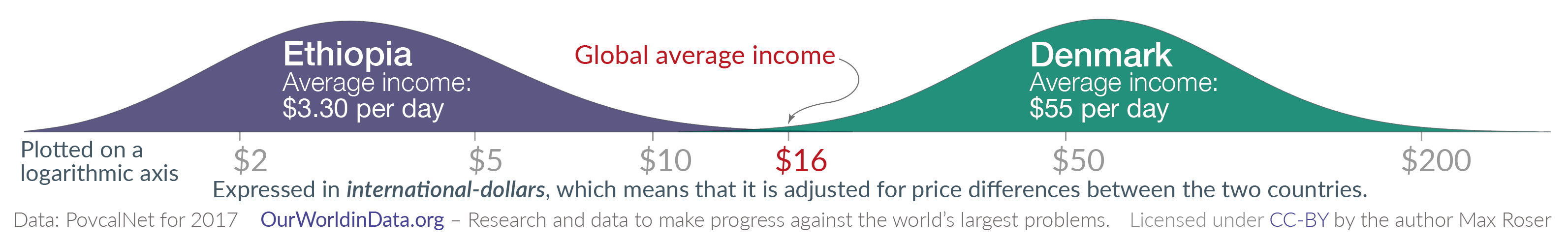 In contrast, consider a situation of extreme inequality between countries, such as today’s inequality between a poor and rich country.1 In this case, the home country of a person determines everything. The shown data for Ethiopia and Denmark makes this clear: the two distributions don't overlap. A person born in Denmark has almost certainly an income above the global average, and someone born in Ethiopia has almost certainly an income lower than that.