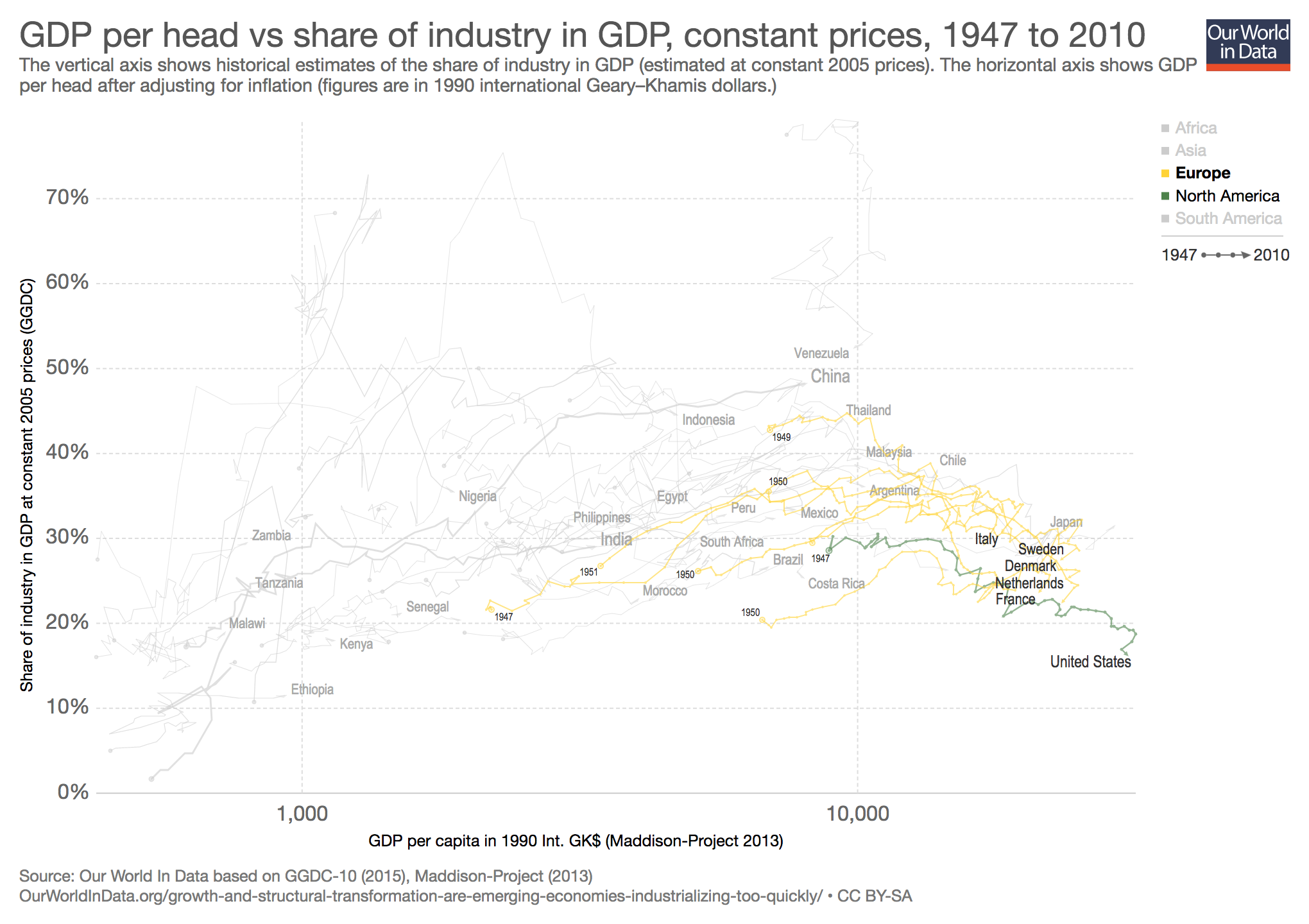 One way to study the process of “structural transformation” across countries is to track how employment changes across sectors in the economy. The below chart does this, plotting the share of industry in total employment (vertical axis) against GDP per head (horizontal axis). This graph is a “connected scatter plot” — each line shows the trajectory that a country followed over time along these two dimensions. Data is available for a selection of more than 40 countries, across all continents.