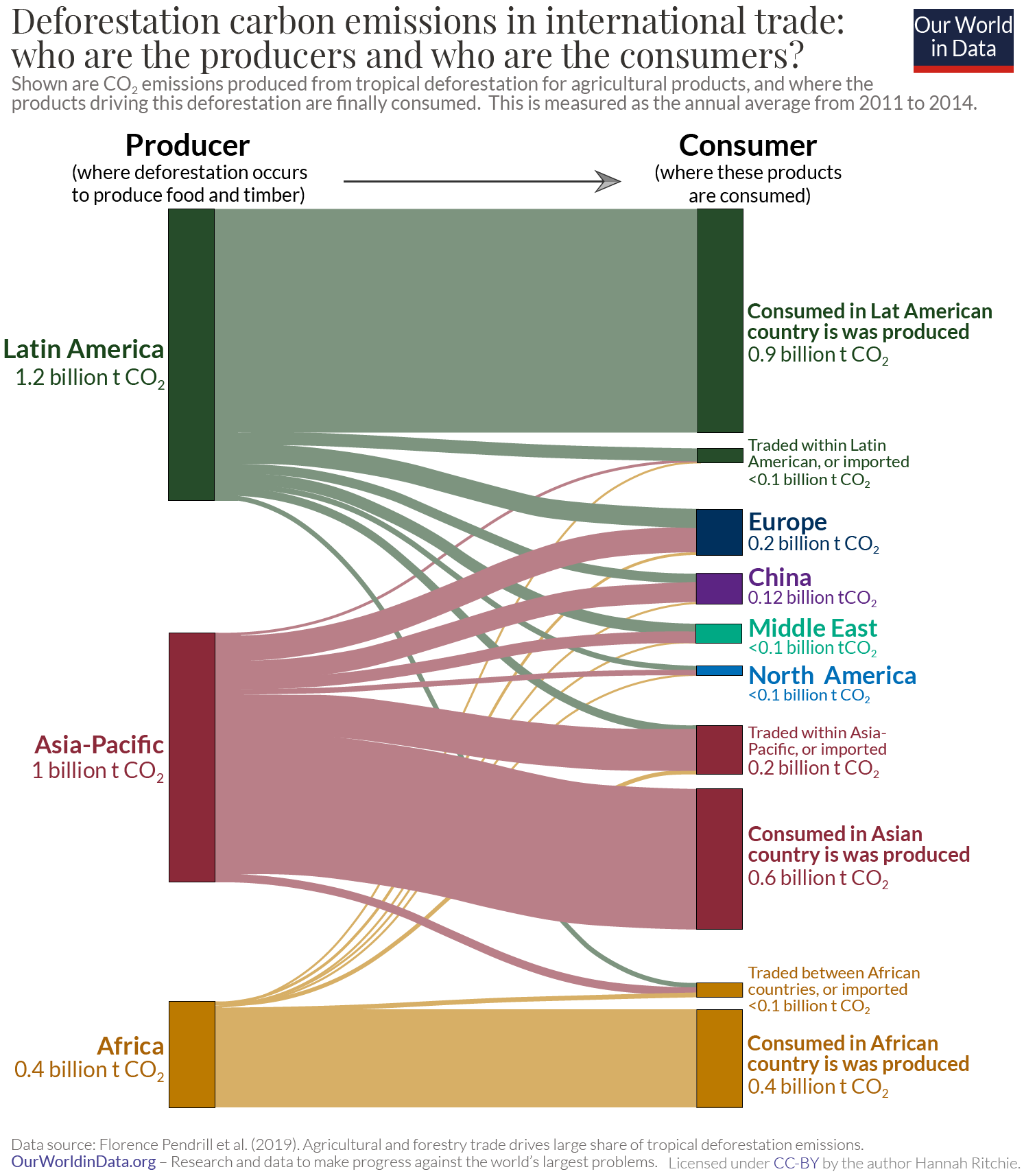 In the chart, we see how emissions from tropical deforestation are distributed through international supply chains. On the left-hand side, we have the countries (grouped by region) where deforestation occurs, and on the right, we have the countries and regions where these products are consumed. The paths between these end boxes indicate where emissions are being traded — the wider the bar, the more emissions are embedded in these products.