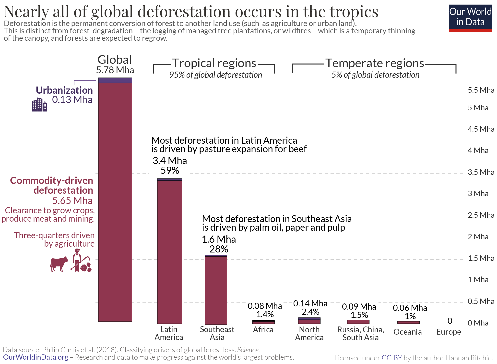 We see massive differences in how important each driver is across the world. 95% of the world’s deforestation occurs in the tropics [we look at this breakdown again later]. In Latin America and Southeast Asia, in particular, commodity-driven deforestation — mainly the clearance of forests to grow crops such as palm oil and soy and pasture for beef production — accounts for almost two-thirds of forest loss.