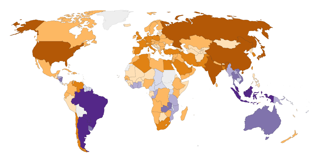 95% of global deforestation occurs in the tropics. Brazil and Indonesia alone account for almost half. After long periods of forest clearance in the past, most of today’s richest countries are increasing tree cover through afforestation.