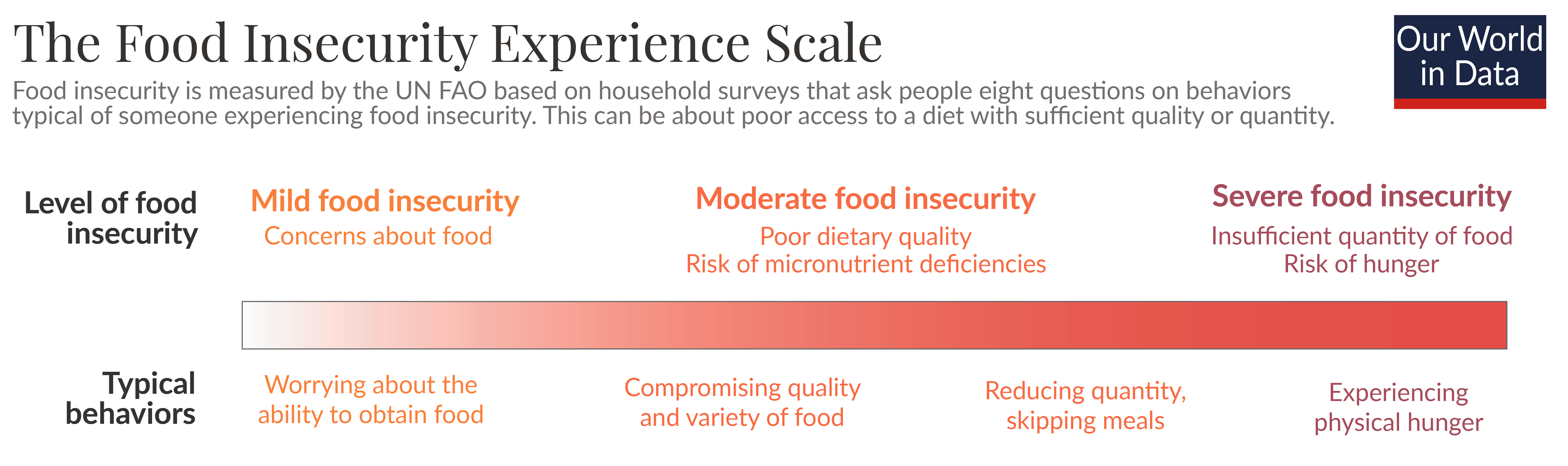 The scale shows the definitions of food insecurity, ranging from mild to severe.