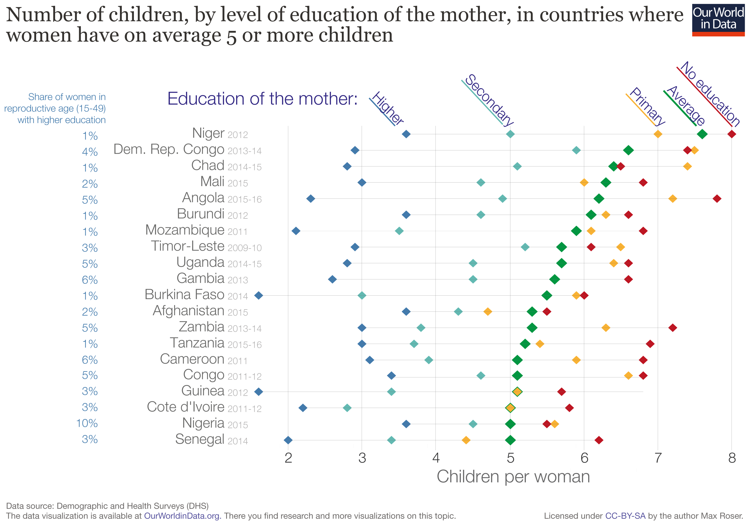 Now, most women are much better educated. Many have eight or more years of education, on average. As we would expect from the theory above, they have had much fewer children. Where women have more than eight years of education, the fertility rate is below four children per woman, and in many countries, it is below two.