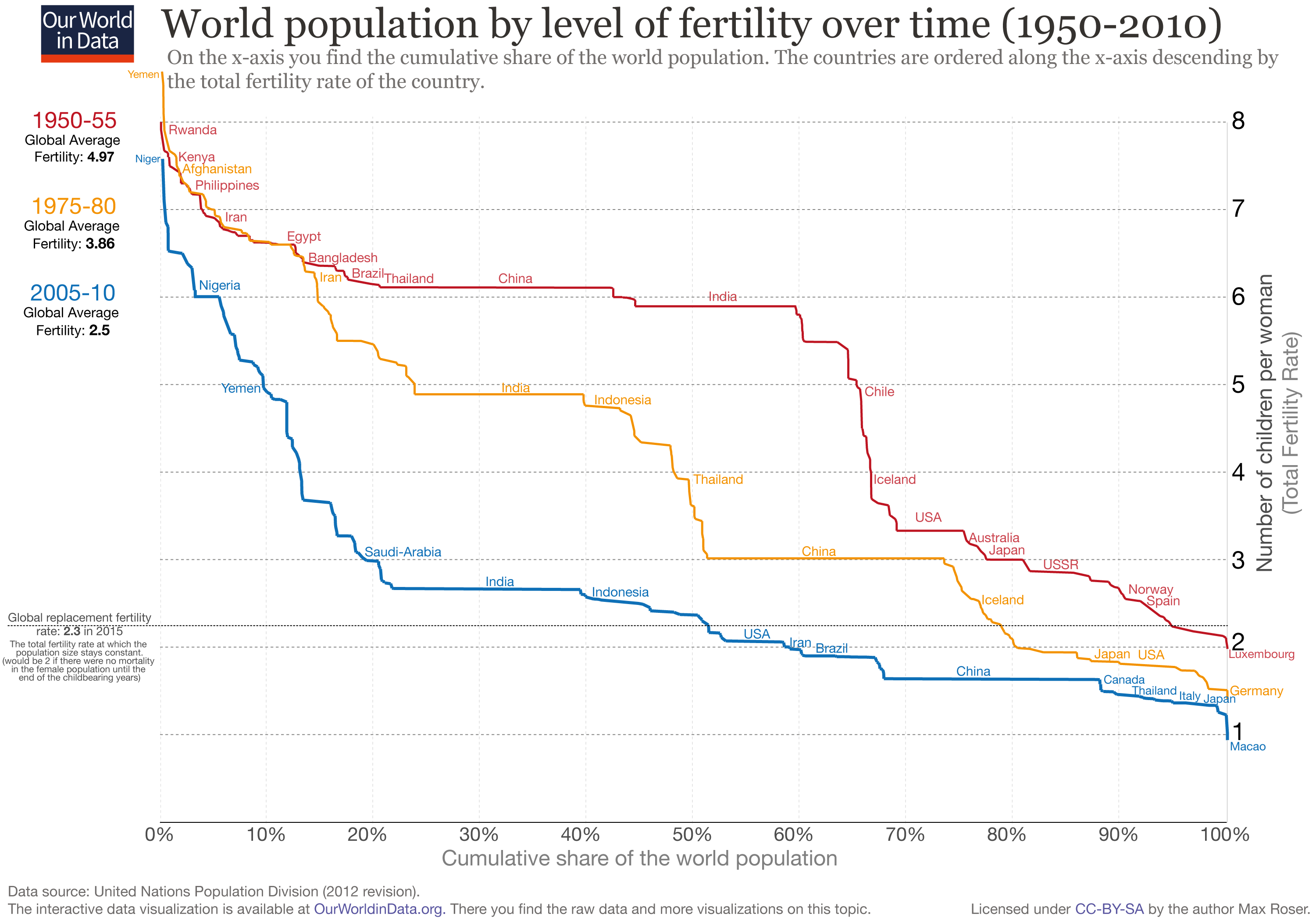 Looking at the orange line, you see that until 1975-80, some countries substantially reduced their fertility: China's fertility rate fell to 3 (this was largely before the introduction of the "one-child policy). Other countries maintained very high fertility levels. In Yemen, the fertility rate was 8.9 children per woman in 1985. The global average was still close to 4 children per woman.