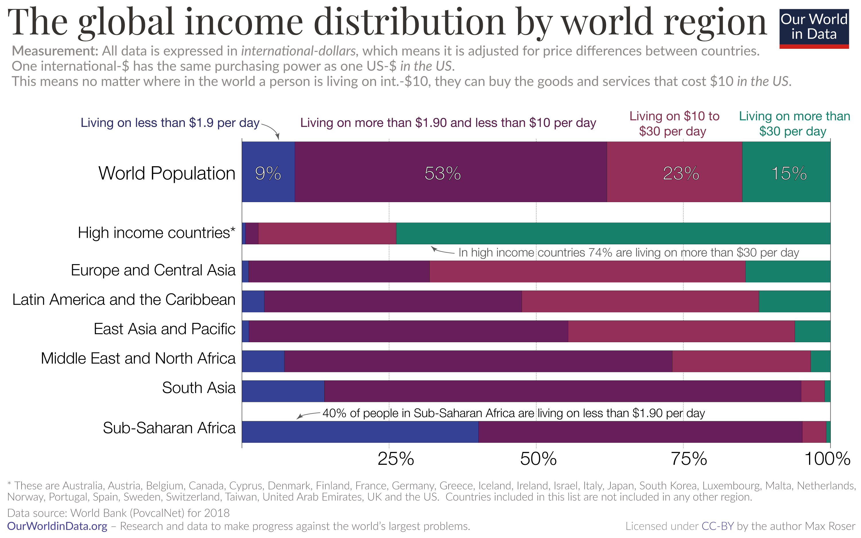 But just as clear from this data is the fact that in many world regions the large majority of people are very poor. In Sub-Saharan Africa about 40% of the population lives on less than $1.90 per day as the chart shows. In all regions outside of high-income countries more than 85% of all people live in moderate poverty.