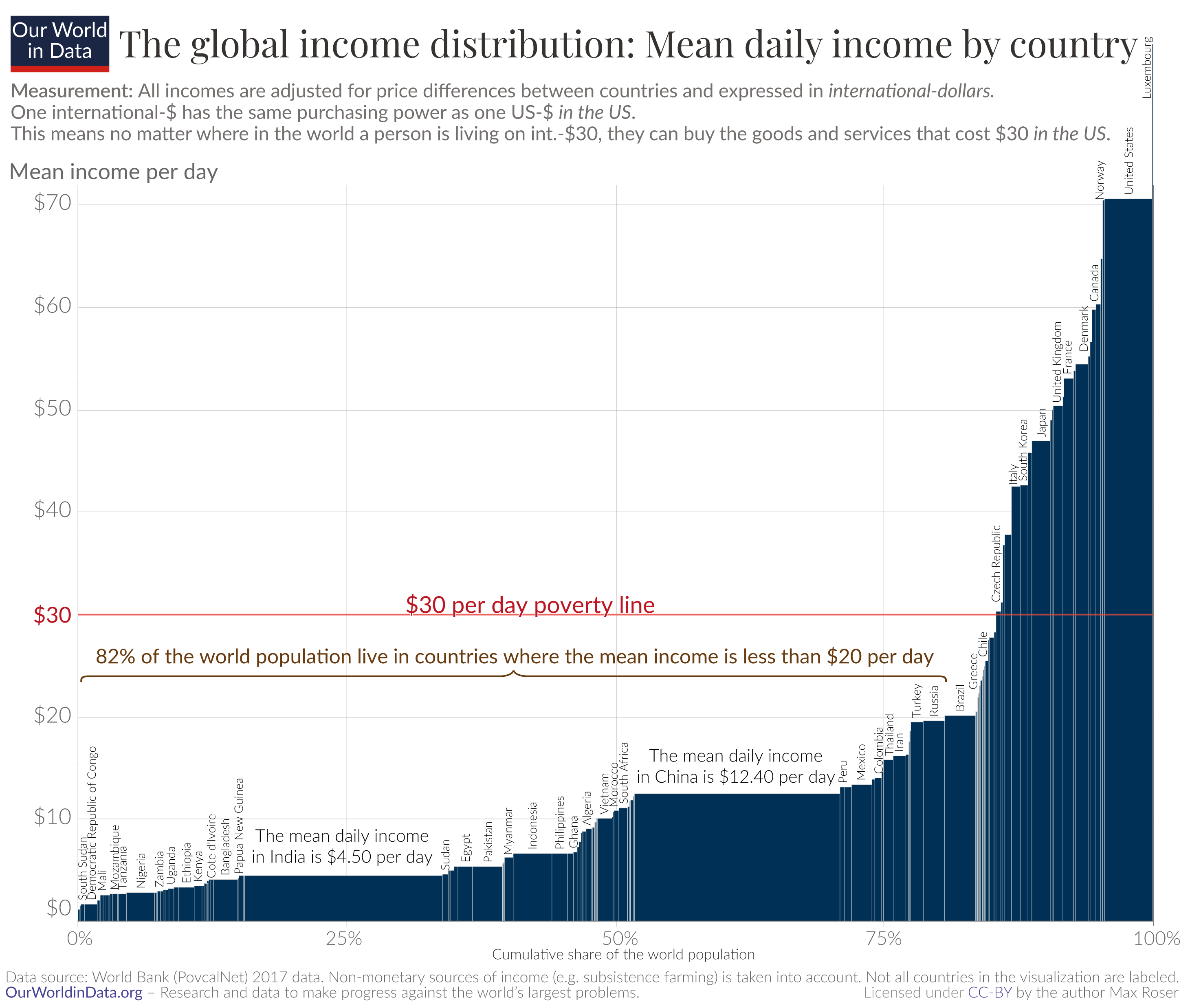 For the moment it is important to note that this $30 per day poverty line is defined in international-$ and therefore comparable with the ‘International Poverty Line’ discussed in the following section. Much more details about how to compare incomes across countries, the income concept here, and the definition of this poverty line follows further below in this text.