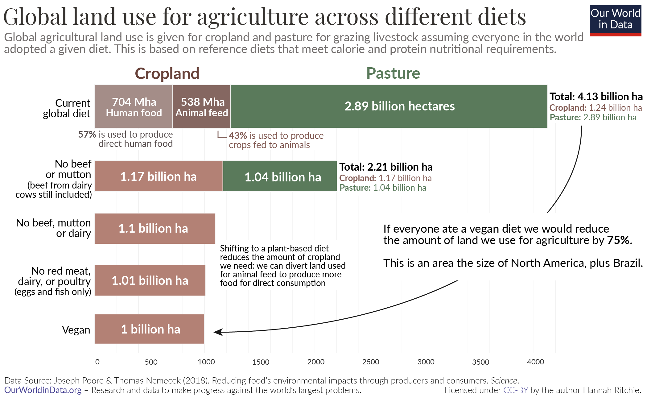 title = {If the world adopted a plant-based diet, we would reduce global agricultural land use from 4 to 1 billion hectares},