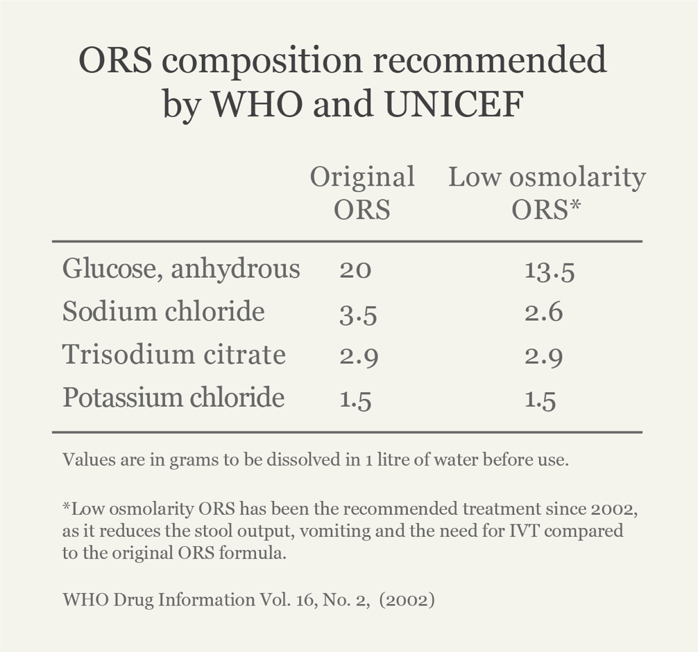 ORT is an incredibly simple therapy: a mixture of water, salt and sugar. It can be administered orally, without the need for special medical assistance. Simple as it may seem, the medical journal The Lancet has called ORT “the most important medical advance of the 20th century”.3