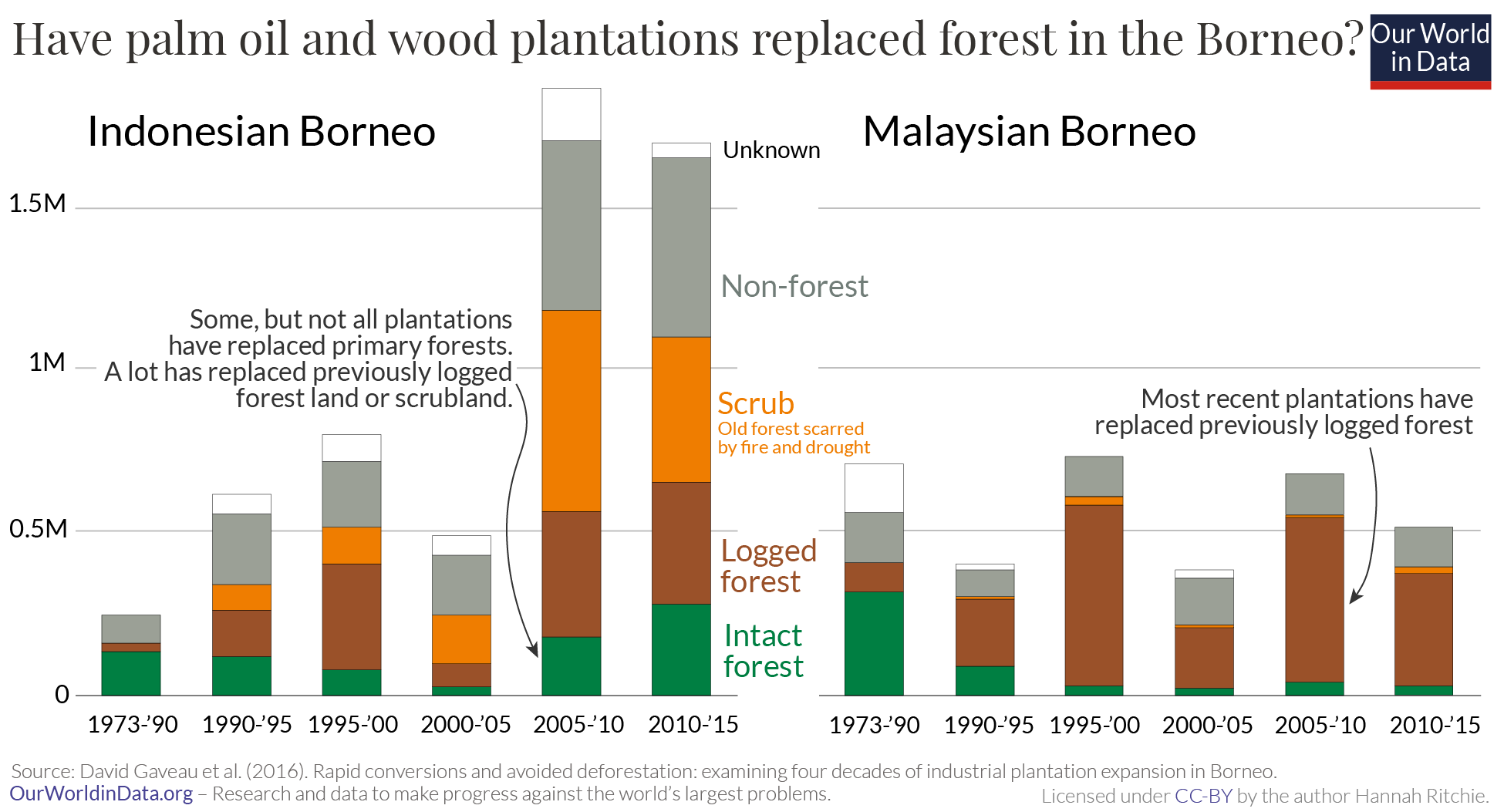75% of these plantations were grown on land that was previously forested in 1973. Not all of these plantations were the direct drivers of this replacement. In fact, only one-quarter of post-1973 plantations in Borneo were driven by the rapid conversion of this land to plantations (20–21% oil palm; 4.3–4.8% pulpwood). This is shown in green in the chart. Direct deforestation for palm oil played a larger role in Malaysia; 60% was driven by plantations, whilst in Indonesia, it was only 16%.