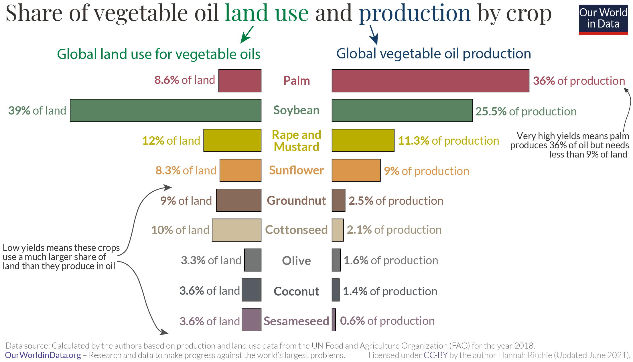 We know from our yield comparison that palm oil achieves a much higher yield. What this means is that it accounts for a very high share of oil production without taking up much land. In 2017, it produced 36% of our vegetable oil but took up only 8.6% of the land.