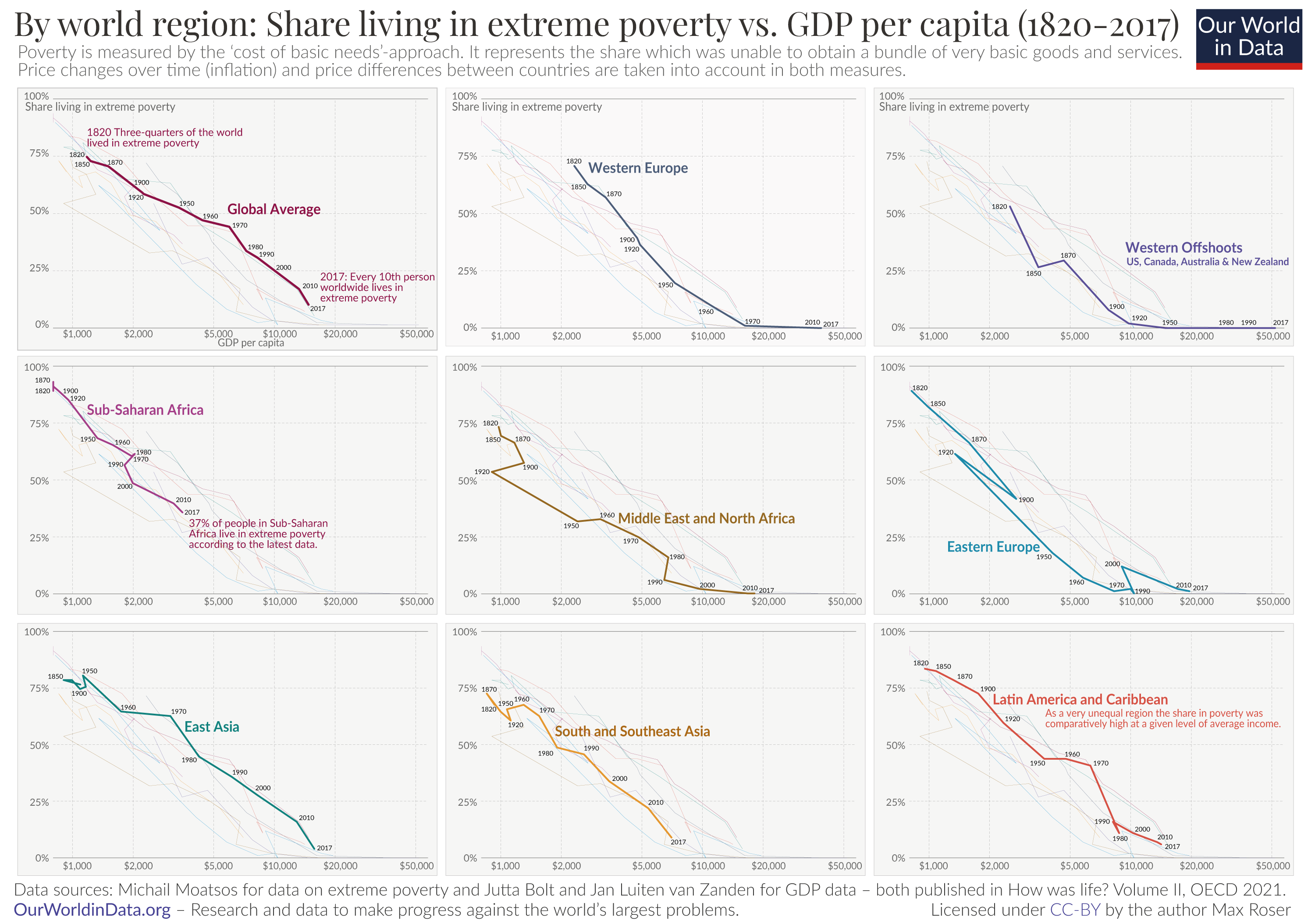 In the top left panel, you can see how global poverty has declined as incomes increased; in the other eight panels, you see the same for all world regions separately. The starting point of each trajectory shows the data for 1820 and tells us that two centuries ago, the majority of people lived in extreme poverty, no matter where in the world they were at home.