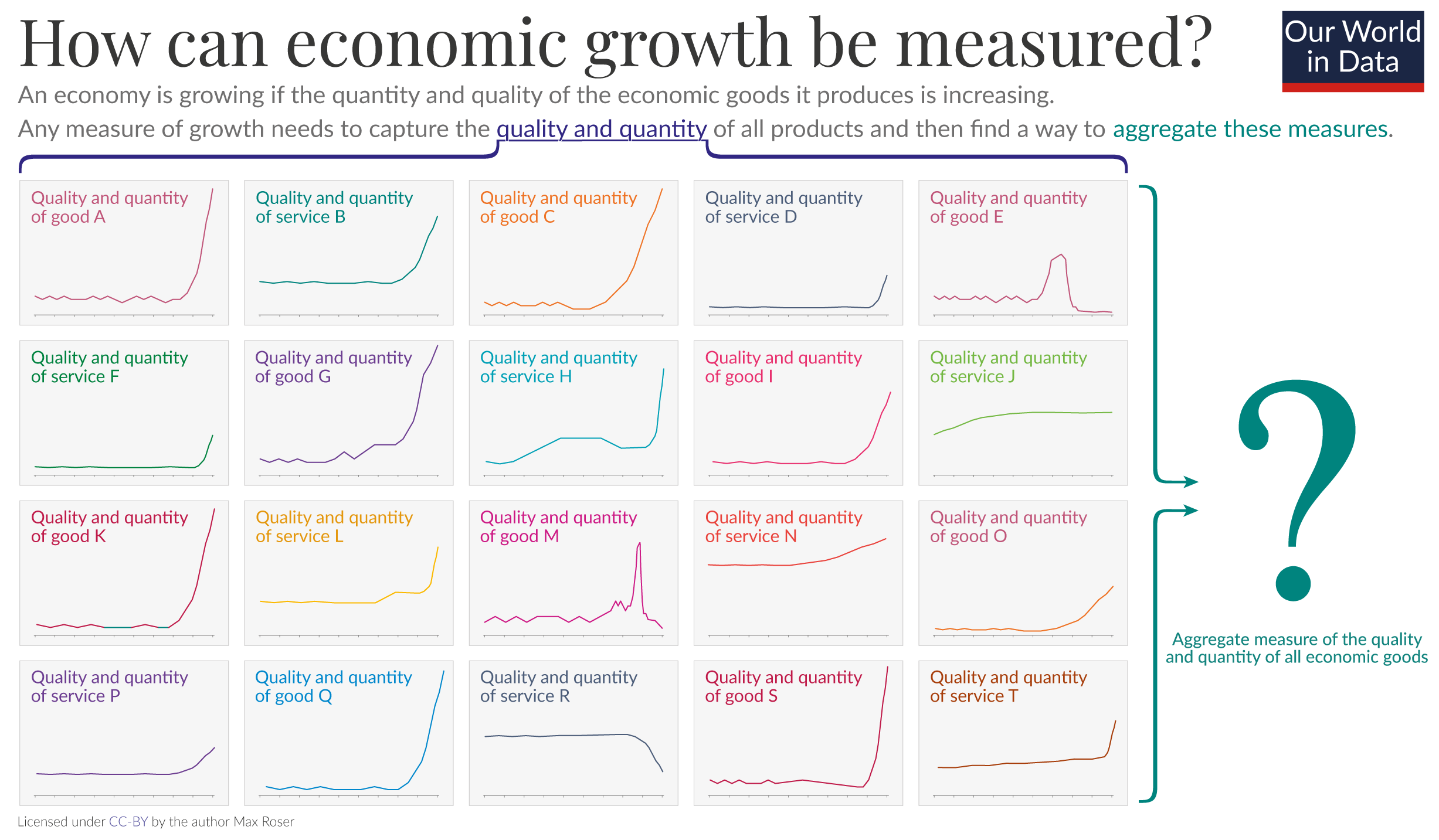 We do this very often at Our World in Data. The chart here shows the share of the world population that has access to four basic resources. All of these statistics measure some particular aspect of economic growth.