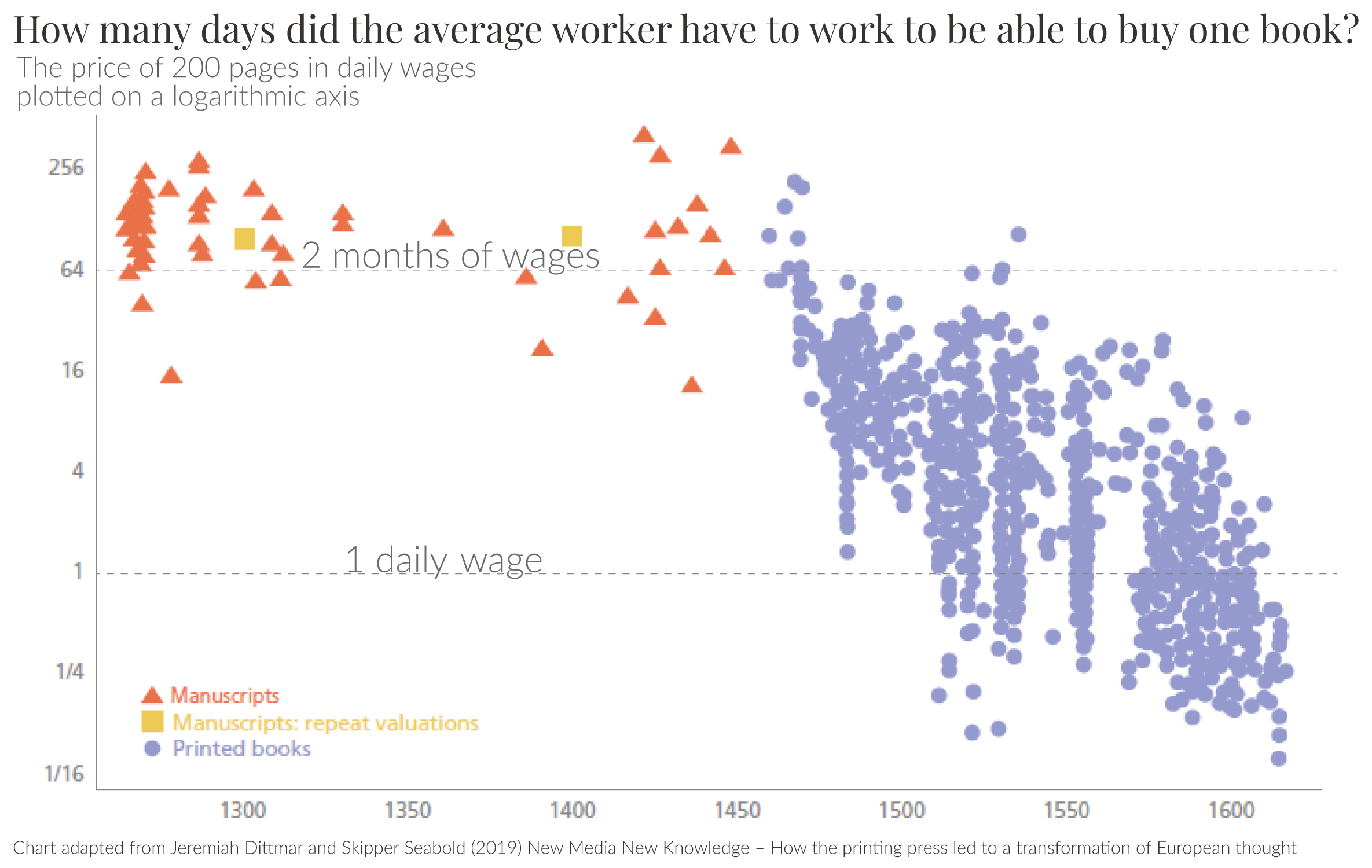 The chart also shows how this changed when the printing press increased the productivity of publishing. As the labor required to produce a book declined from many months of work to less than a day, the price fell from months of wages to mere hours.