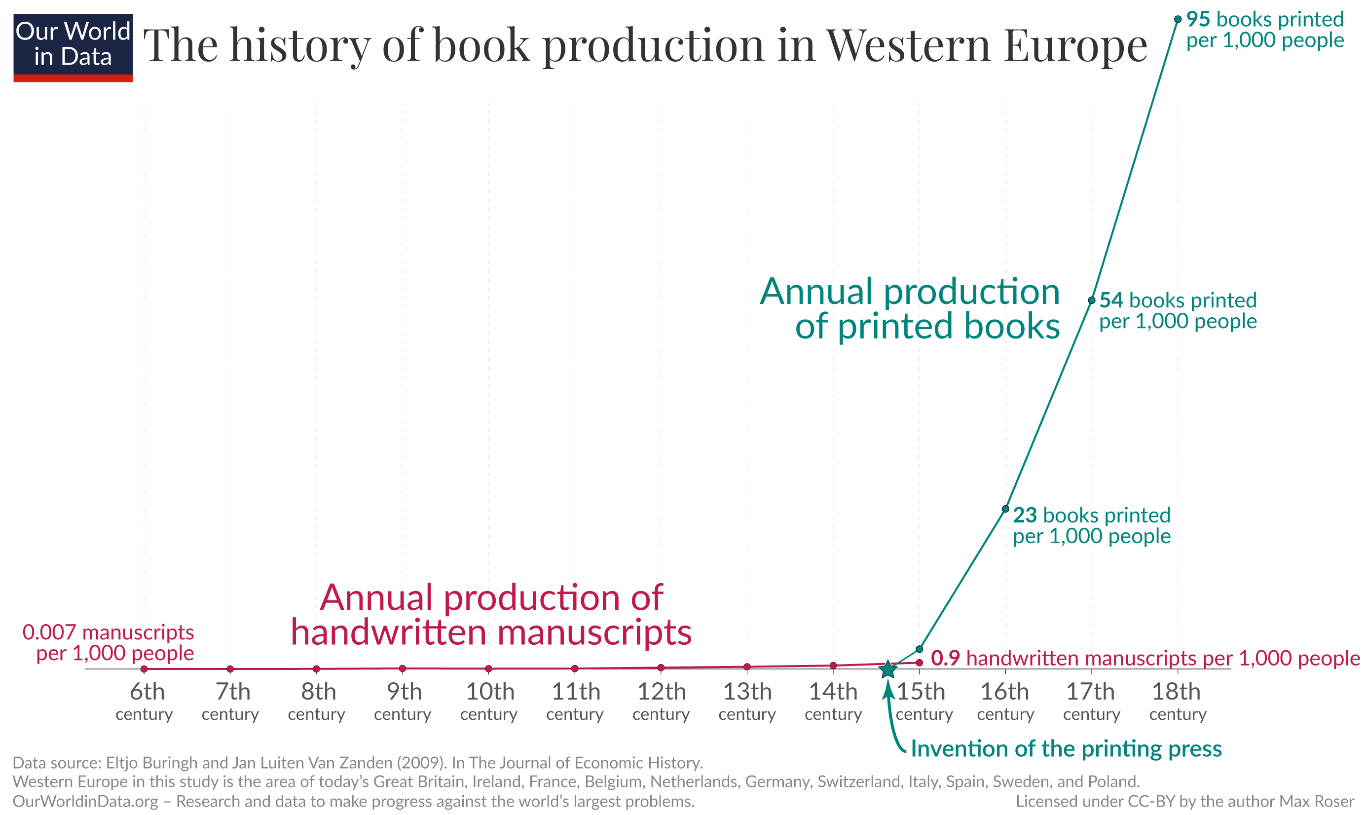 The data is taken from Eltjo Buringh and Jan Luiten Van Zanden (2009) — Charting the “Rise of the West”: Manuscripts and Printed Books in Europe, a Long-Term Perspective from the Sixth through Eighteenth Centuries. In The Journal of Economic History Vol. 69, No. 2 (June 2009), pp. 409-445. Online here.