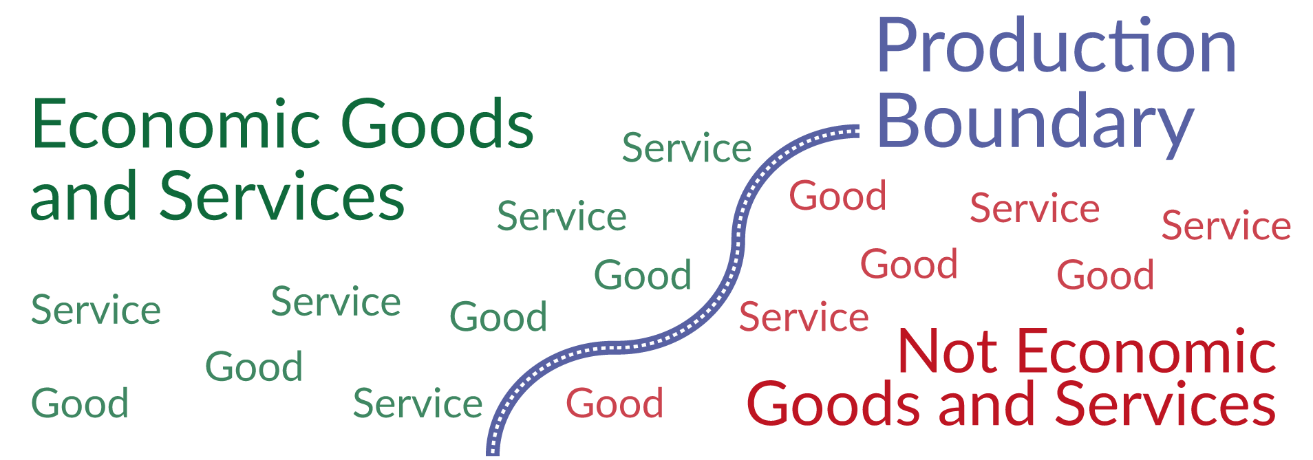 The line that we have to draw to define the economic goods and services is called the ‘production boundary’. The sketch illustrates the idea. The production boundary defines those goods and services that we consider when we speak about economic growth.
