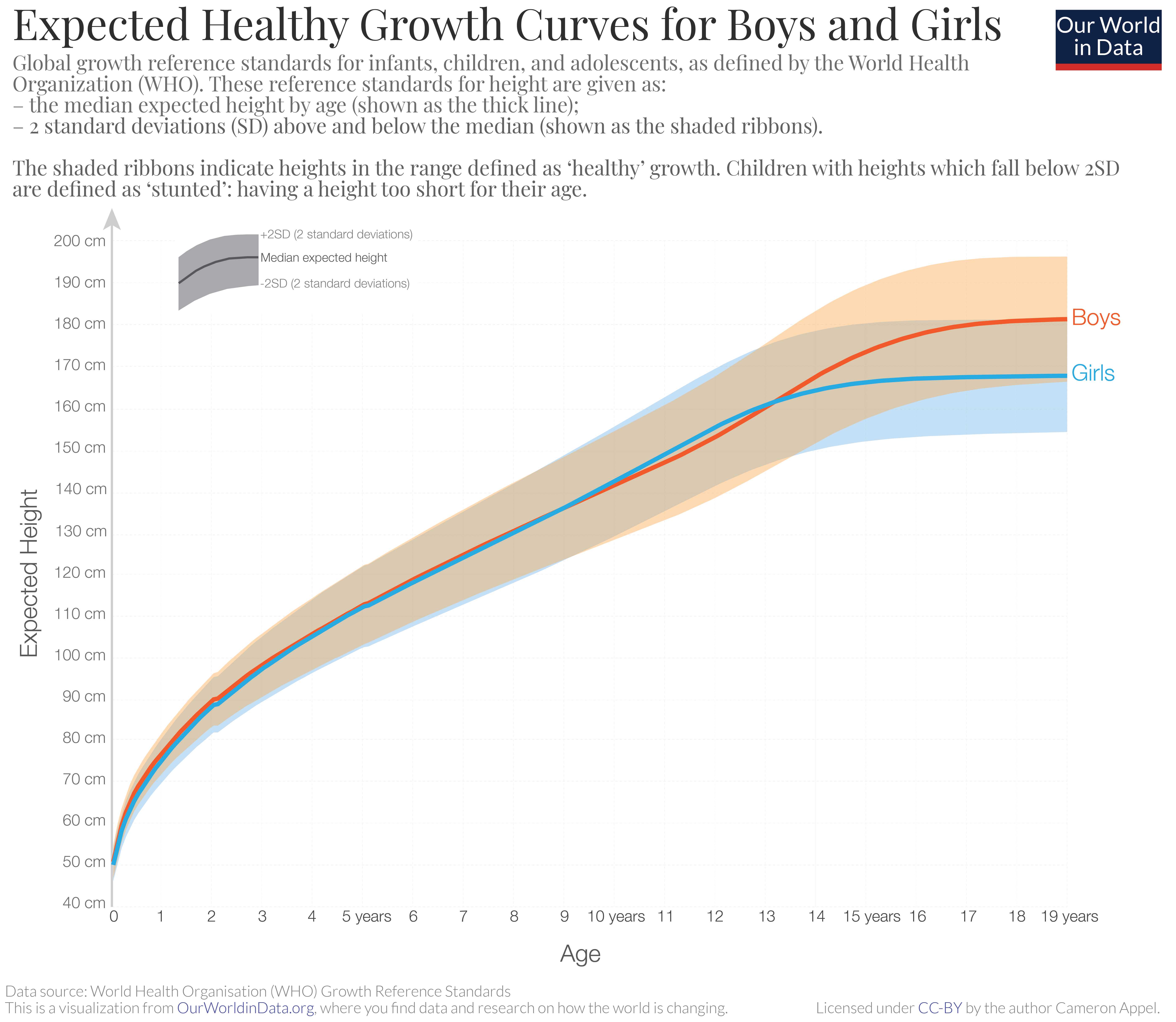 We see these growth curves for boys and girls in the chart. The median growth curve is shown by the thick line. The ribbons around this median show the ‘acceptable’ range. This range is two standard deviations above and below the median.