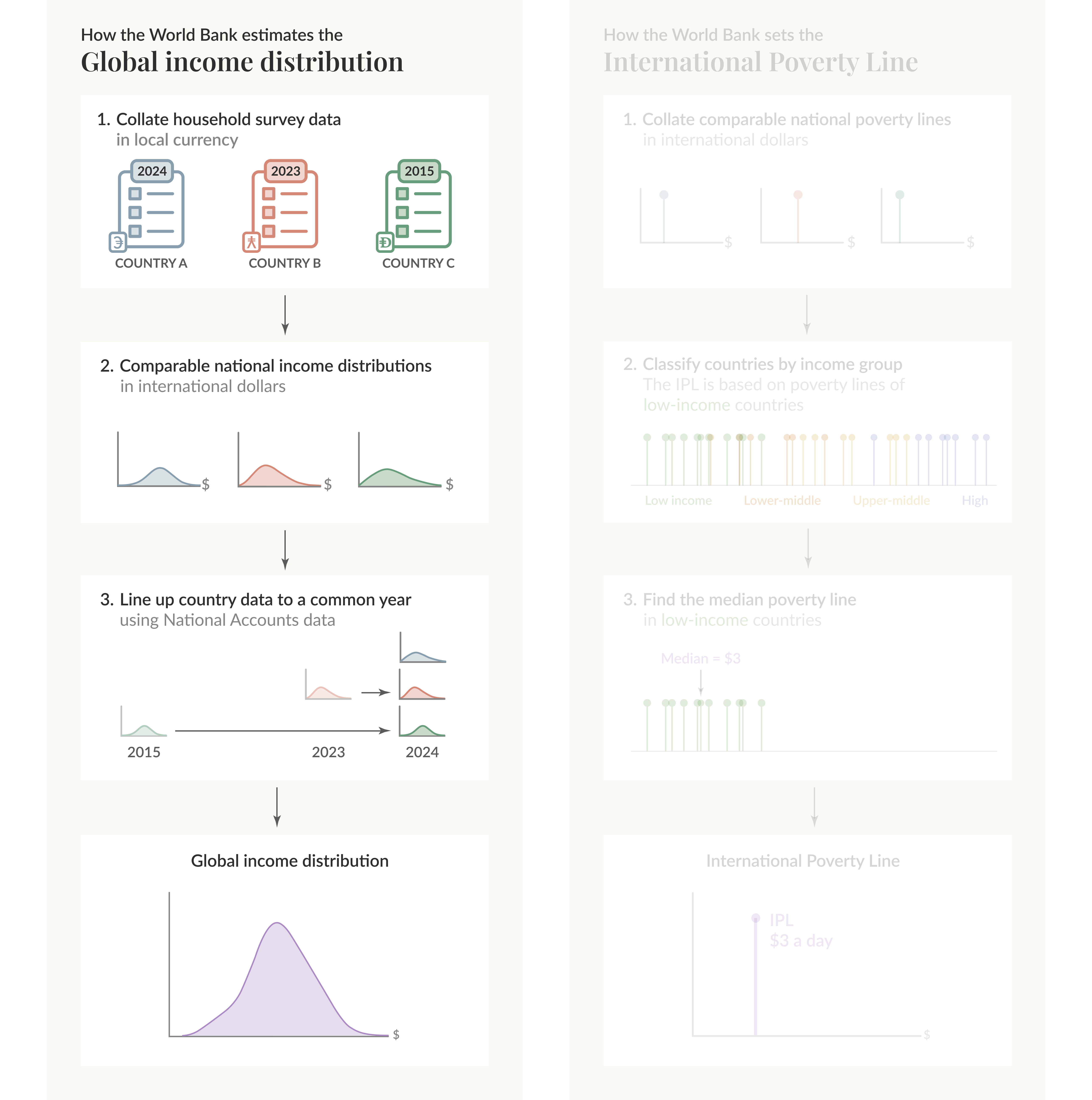 Estimating global extreme poverty involves two parts, illustrated in this figure and discussed in more detail below.
