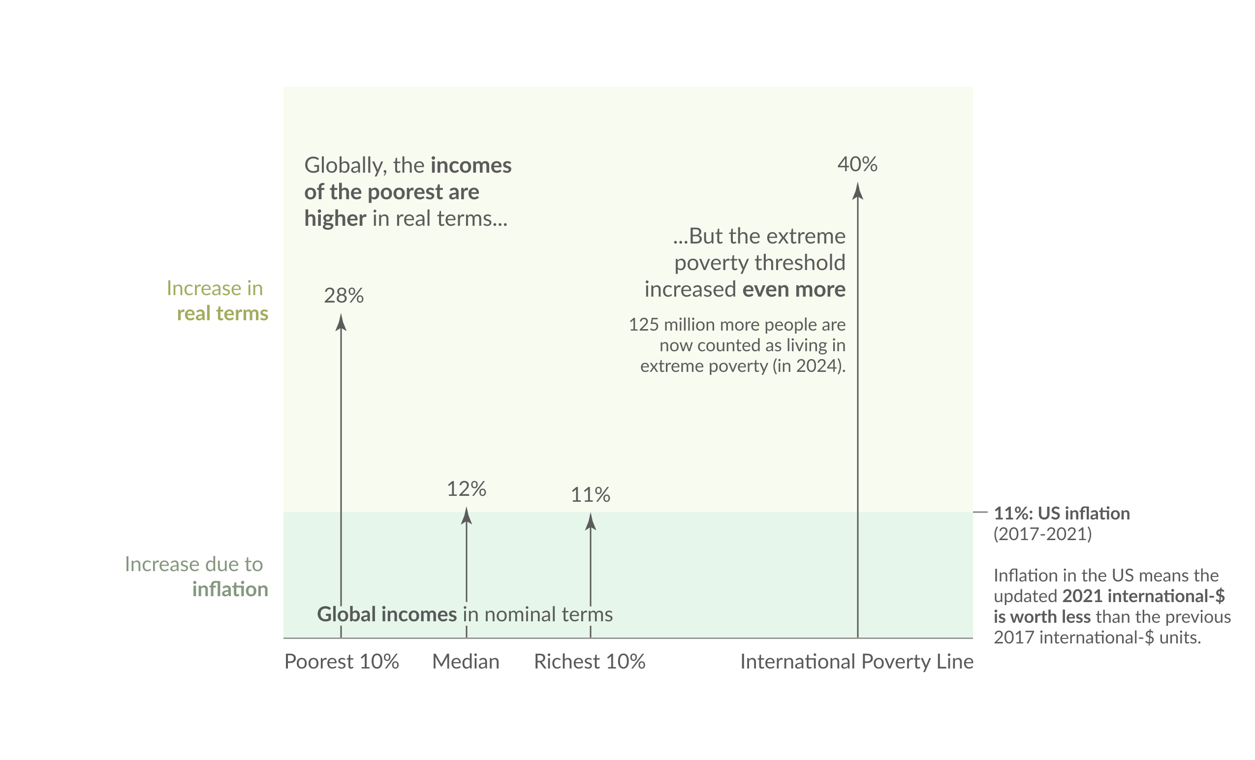 The arrow on the left shows the change in the income level that places someone in the world’s poorest tenth in 2024. This rose by 28% in nominal terms, from $2.34 per day (measured in 2017 international-$) to $3.00 per day (in 2021 international-$).