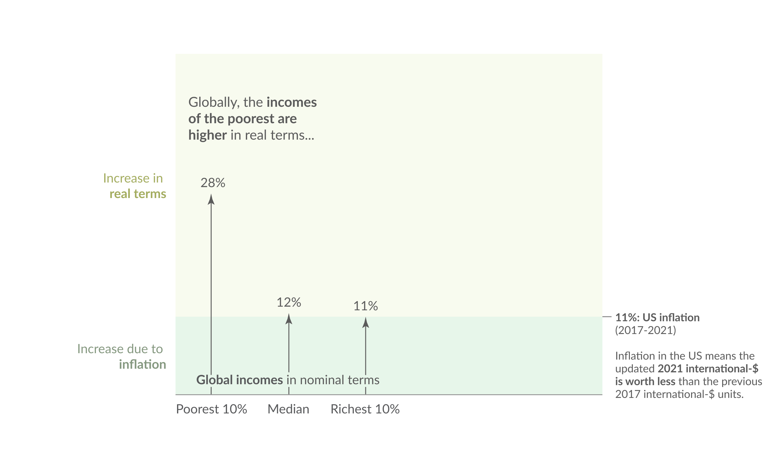 A nominal increase of 11% — in line with US inflation in this period — means that the income of high-income countries is, on average, the same in terms of purchasing power measured in either unit. There has been a greater increase among low-income countries, so they are, on average, slightly better off when incomes are calculated in the new 2021 international-$.
