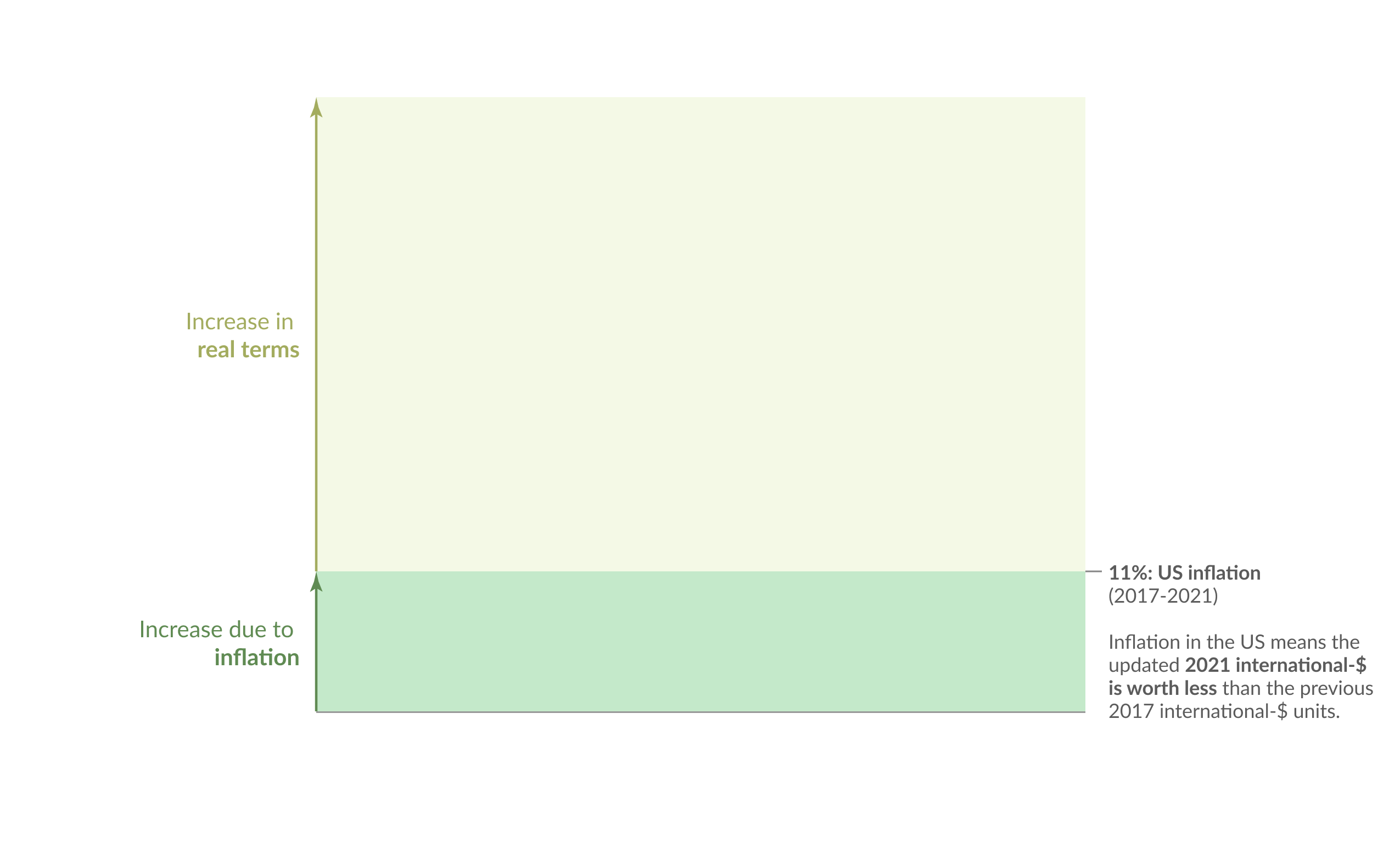 As we explain in our article on international dollars, the value, or “purchasing power” of one international-$ is benchmarked to what one US dollar can buy in the United States. Prices in the US rose on average between 2017 and 2021 — about 11% in total.10 This means that one 2021 international dollar (the World Bank’s new units) is worth less than one 2017 international dollar (the old units). You need more 2021 international-$ to buy the same amount of goods and services.